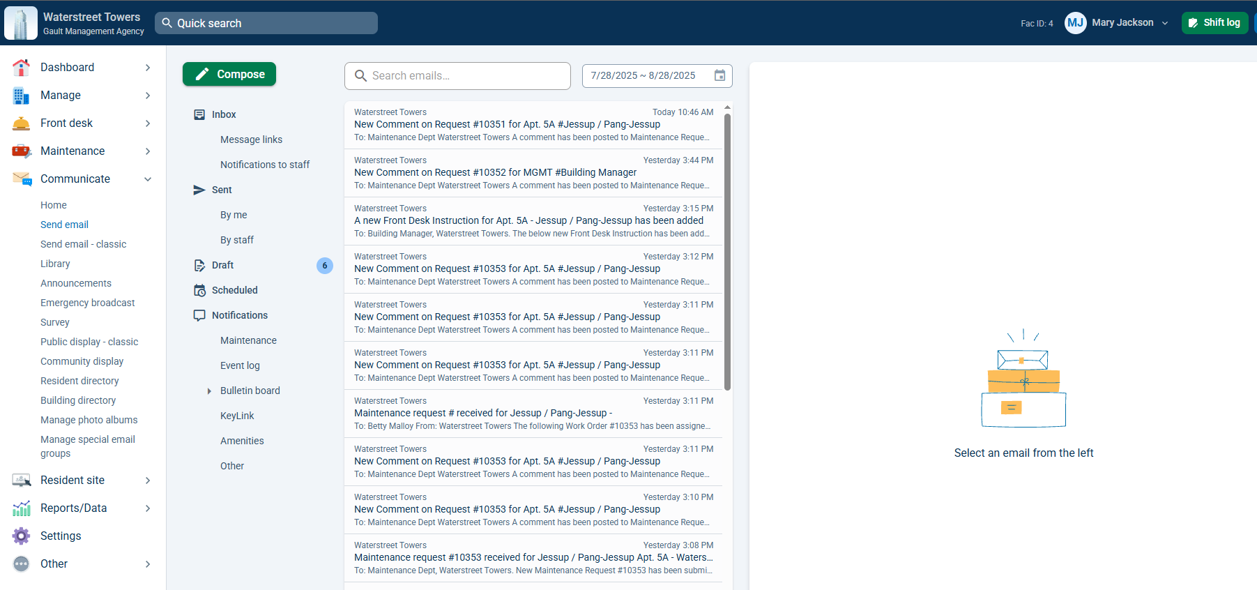 To view sent emails, click on the Communicate tab and select Send Email. This will take you to the Inbox tab that displays messages sent to recipients of any message links you've set up as well as any automatic notifications generated by BuildingLink to building staff. Selecting the Sent tab displays any emails manually sent by you or by staff. Finally, selecting the Notifications tab will show a history of any automatic notifications sent to residents via BuildingLink. These notifications are even broken up by module for your convenience! If you prefer, you can also use the search function at the top of your mailbox to find messages by date range, recipient, or subject.
