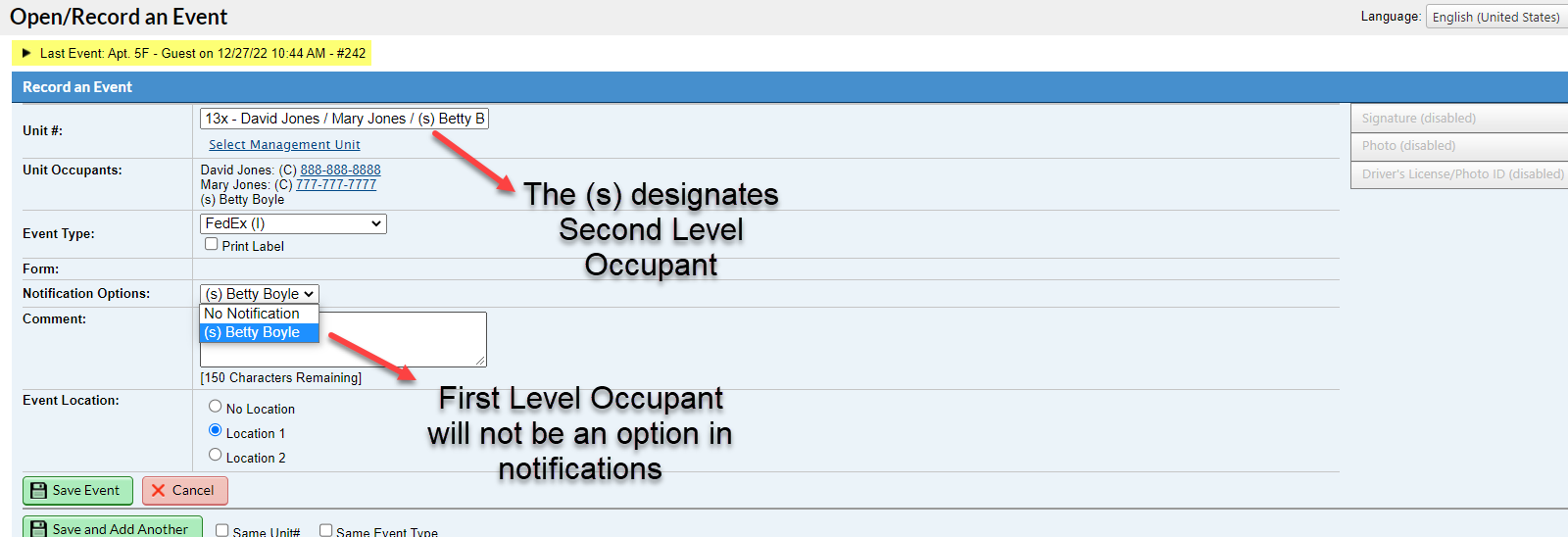 Please note: In a unit with at least one second-level occupant (e.g. Renters, Tenants, Subtenant etc...), BuildingLink will provide only the option to notify the Second-Level occupant(s). The assumption is that when you have a Second Level occupant in the unit, the First Level occupant does NOT physically live at the property and should not be receiving mail/items there. In the event that the first and second-level occupants live in the same unit on property, you may move that second-level occupant to a first-level type (e.g.: roommate) to see them as an option in the Notification Options drop-down menu. Alternatively, if a First-Level occupant must be notified of an event or delivery and there is a Second Level occupant in that unit, you will need to reach out manually via call, or email to notify the offsite Owner/Occupant.
