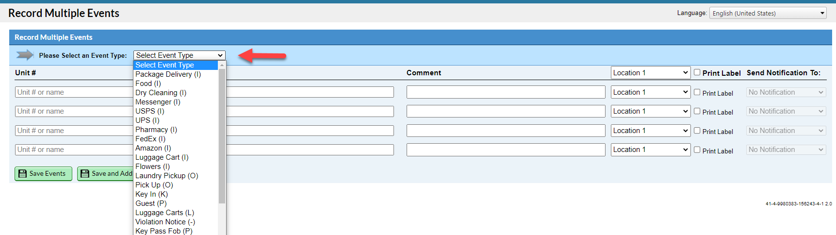 If the items that are being given away to the same person are logged under different apartments (Ex. ABC Cleaners is picking up laundry bags from five different units or UPS is picking up outgoing packages from 3 different apartments), click on the red Close Multiple Events button from the Open-Event Grid. Next, select the appropriate Event Type from the drop down menu in the upper left. Generally, there will be two options: Laundry Pickup and Package Return. Keep in mind that selecting either of these options will pull up ALL the laundry pickups or package returns in the system, regardless of whether they are for the carrier or laundry company that is actually on site. Be sure to use the comment to identify the correct items and select only those items that are going to the carrier or laundry company in question. For package returns that have a previously scanned barcode, you can use our barcode shortcuts to quickly close out the correct items.