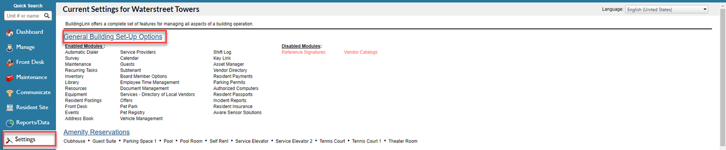 Residents marked as “Board Members” will always be able to view any Calendar entries, Library documents, or Survey Questions with “Board” permissions. However, you can also set some additional global permissions for Board Members in the Settings section. To view the settings for your Board, click on the Settings Tab and select General Building Set-Up Options.