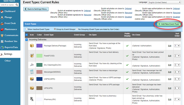 OverviewSettings for the Event Log are controlled by the Event Types option in the Settings tab. (Only Management and Security Officer users have access to Event Type settings.) All Event Types are grouped under specific headings (Event Groups) to make it easier to track and view those items. Your Event Types are customizable and should reflect the items or people that you receive and track at the front desk or office, as well as any other items for which you need to capture signatures, photos, or maintain an item or event "history." |