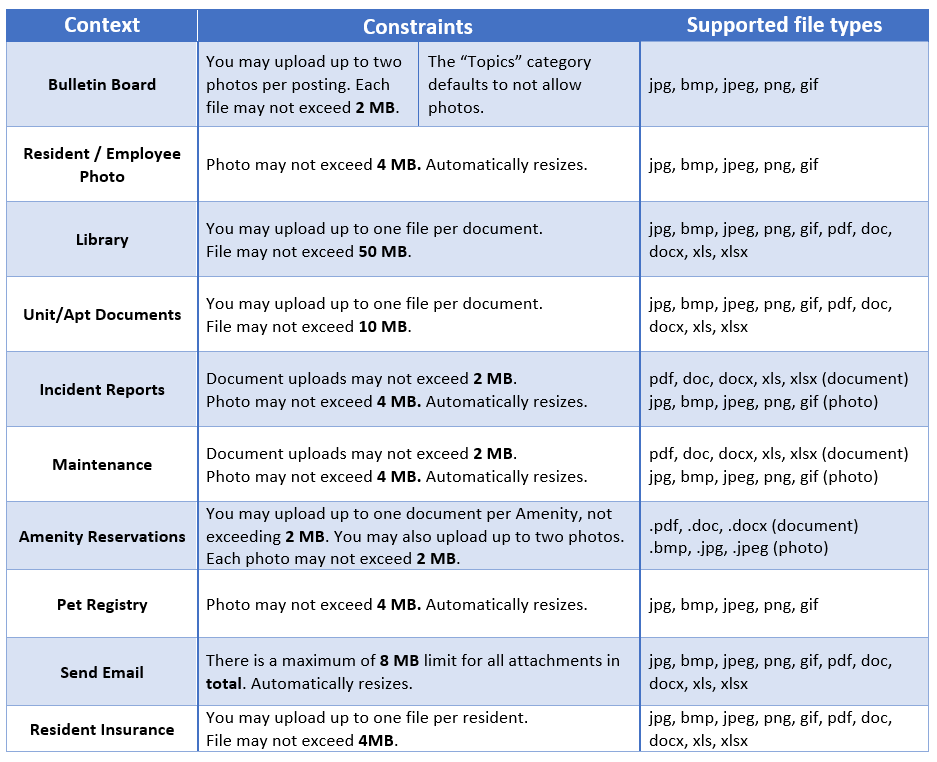 OverviewThis help topic lists general specifications for uploading files to different modules within BuildingLink. It also provides some tools you can use to reduce document and image sizes. |