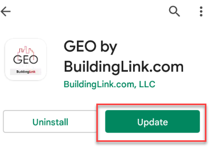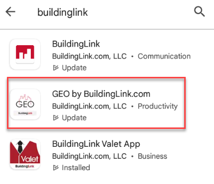 Navigate to the Apple App Store or Google Play Store and search for Buildinglink. Select the App called "GEO by BuildingLink.com." (Click Here for IOS -- Click Here for Android)