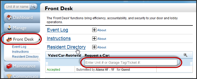 Residents can submit car requests from the resident portal or the BuildingLink Resident App, but building staff can also submit requests on a resident's behalf. To do so, click on the Front Desk Tab. To the right of the Valet/Car Retrieval heading, there is a field labeled Request a Car. Enter the unit number or ticket number of the car you wish to request.