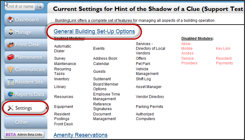 If you are a Management or Security Officer user and you’d like to add instructions for residents to see when submitting a car request, click on the Settings tab and select General Building Set-Up Options. Then, scroll to Garage/Valet and enter any relevant instructions. Be sure to click Save All Changes.