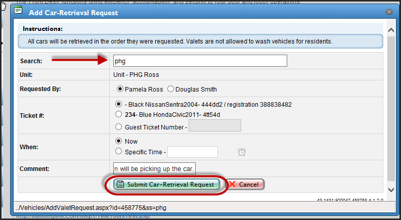 Click Submit Car-Retrieval Request.