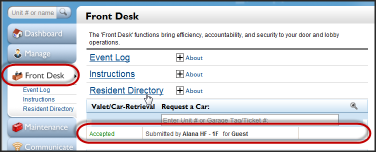 From the Front Desk tab, you will also be able to see all vehicle requests that have been accepted or are still pending. If the request is still pending, it will be labeled as "Requested" instead of "Accepted."