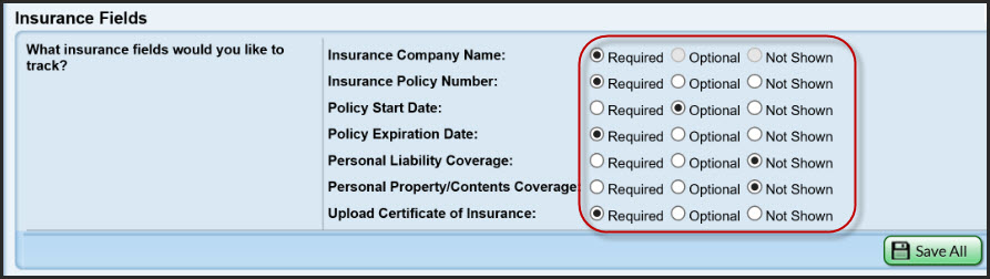 Once you have your requirements and automated email queues customized, the next step is to decide which fields you’d like to track, and which of those trackable fields will be required in order for residents to submit their policy information. After selecting the desired fields, click Save All.