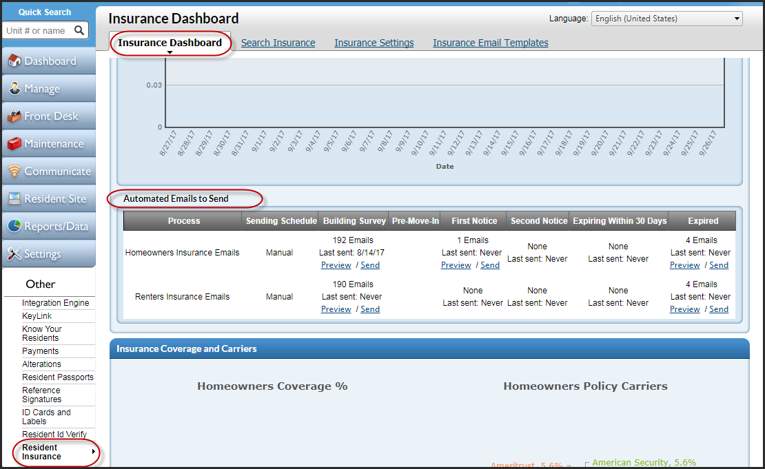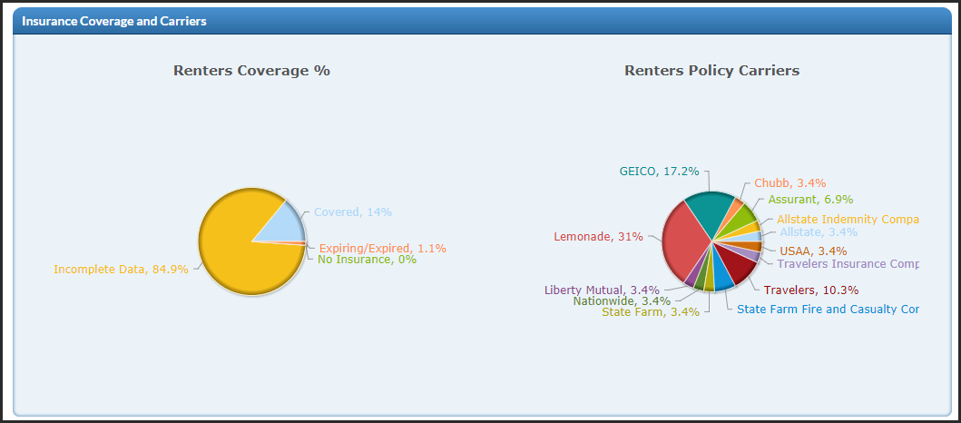 The Insurance Dashboard (Other -> Resident Insurance -> Insurance Dashboard) will display a graph showing the number and type of insurance emails sent to your residents. Under Insurance Coverage and Carriers, you'll also be able to see a pie chart display of your residents' insurance coverage.