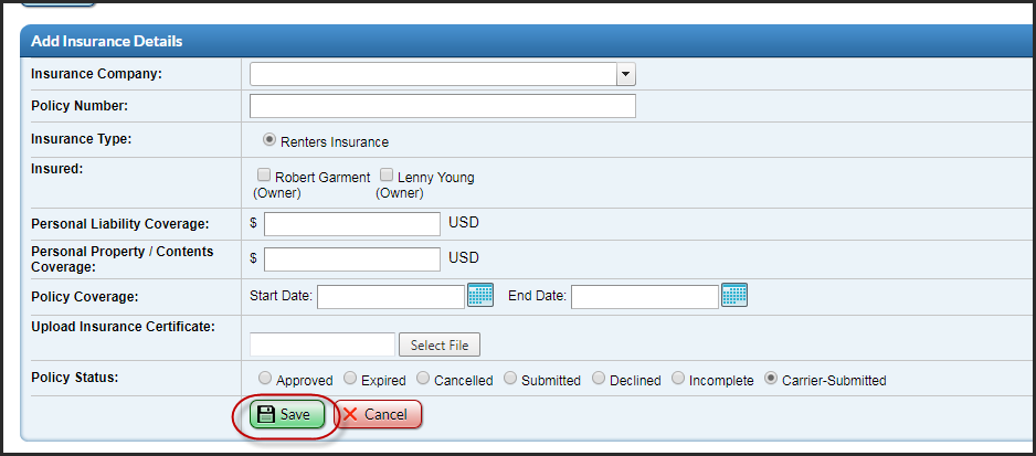 To change the status of a policy or edit any of the information, simply click on the entry in question. You’ll be able to change the status of a “submitted” policy to “Approved,” for example, meaning that the resident info submitted has been deemed valid by management, or, if the policy info is clearly inaccurate, you might decide to change the status to “Declined.” Please note that all statuses must be changed manually, so if you need to note that a policy is expired, you will need to change the status to “Expired.”