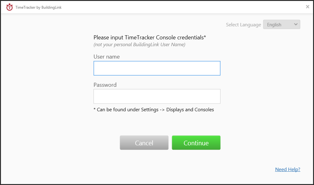 Once the fingerprint reader is installed, you will need to create a TimeTracker console. To do so, click on your Settings tab and select Displays and Consoles. Click Add Display/Console. Under Console Type, select TimeTracker Console. (If you don't see this option, the Employee Time Management module has not been turned on for your property. Contact BuildingLink Support to turn it on.) Choose a Console Name (Ex. TimeTracker) and then a Login name (Ex. Name of Property TT) and Password. Click Save to save your console.