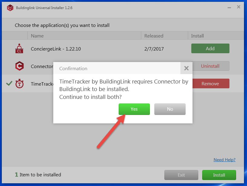 If you don't have BuildingLink Connector installed on your computer, the system will prompt you to install Connector as well. Click Yes and follow the prompts to install Connector and TimeTracker. (For Connector installation screenshots, visit our Connector help page.)