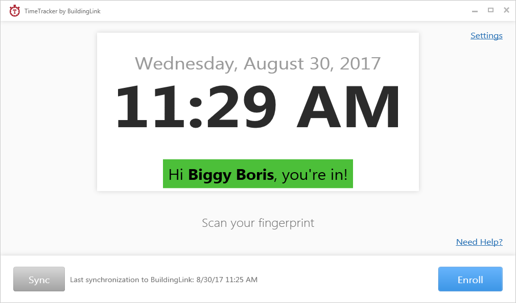 To begin, enroll your own fingerprints. Launch the TimeTracker Console and click the Enroll button.