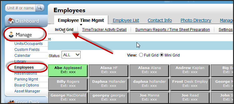 TimeTracker integrates with BuildingLink to provide several features to manage your employees’ time and attendance. To see these features, you must have Security Officer level in BuildingLink. These features are found under your Manage Tab in the Employees Section. Once you’ve clicked on Employees, make sure Employee Time Management is selected.