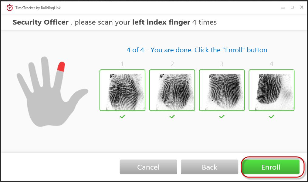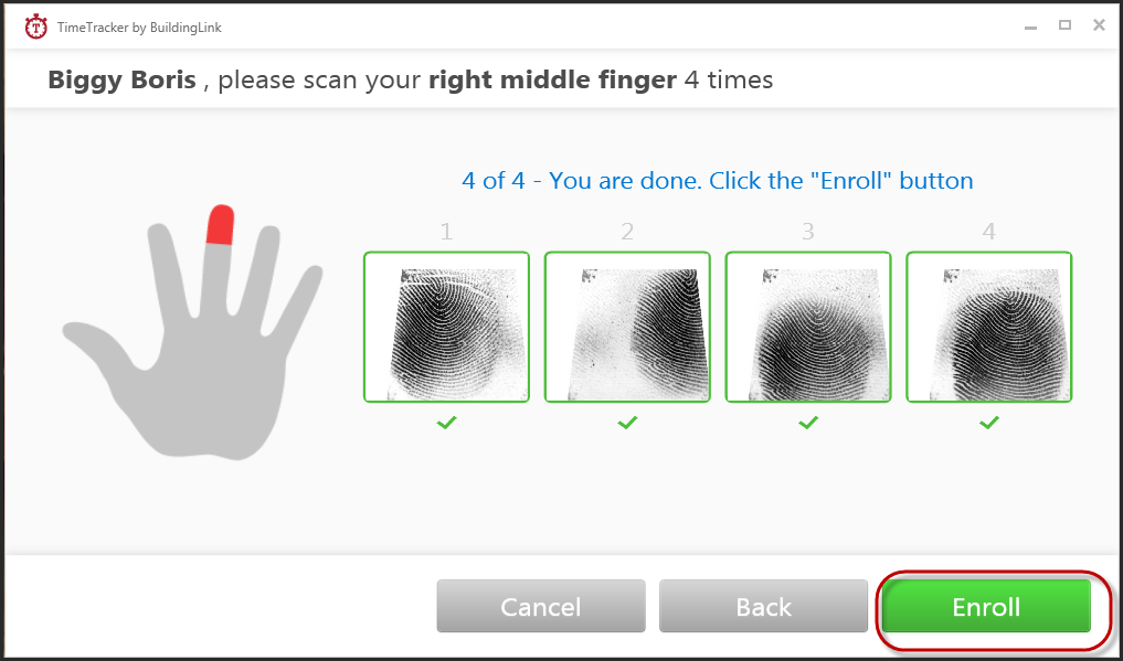 After clicking on the employee’s name, you will see two hands on the screen. Click on the green square that corresponds with the finger your employee plans on using with the Fingerprint Reader. Now, ask the employee to place his/her finger on the fingerprint reader and remove it after 2-3 seconds. Repeat this three more times and click Enroll again. Try to do this fairly quickly as the screen may time out for security reasons and go back to the beginning without saving your fingerprint. If this happens, simply repeat the steps.