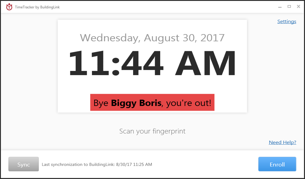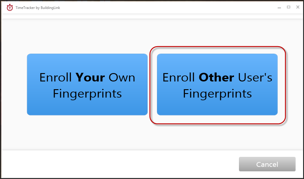Once your own fingerprint has been enrolled, you can start enrolling other employees. Launch the TimeTracker console and click the "Enroll" button. You may sign in with your BuildingLink credentials or place your registered finger on the fingerprint reader. Click “Enroll Other User's Fingerprints" and select an employee from the list. The list will pull from the Employees section of BuildingLink; if a specific employee does not show up on the list, he/she has not yet been added to the BuildingLink employee list, and must be added before a fingerprint can be registered. (Click here for help adding BuildingLink employees.)