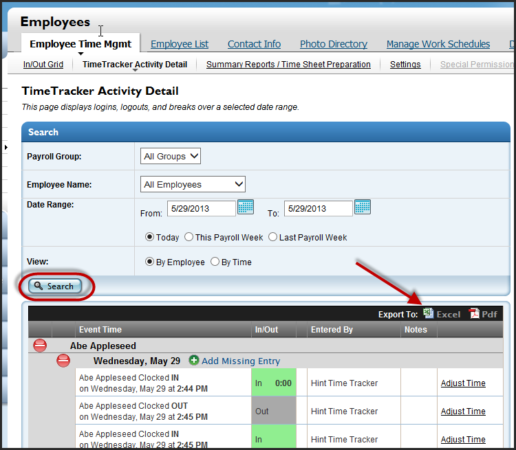 TimeTracker Activity Detail: This section displays clock ins/outs and breaks over a selected period of time. You may choose to see only one employee or all and select any date range. From this screen, you may also adjust times and add missing entries. Finally, you may export the information on this screen to an Excel or PDF file.