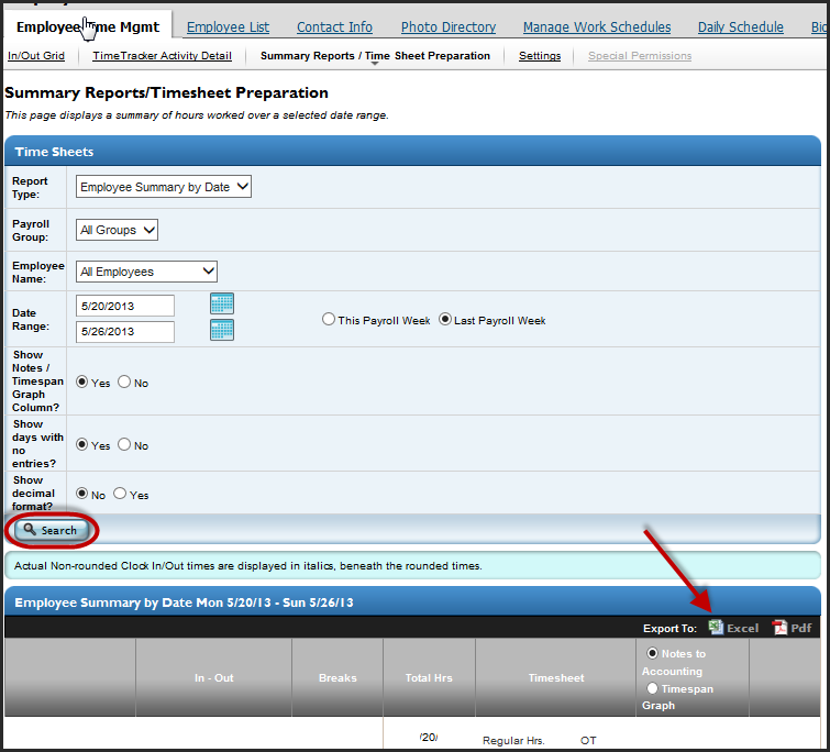 Summary Reports and Timesheet Preparation: This section shows a summary of hours worked over a selected date range for timesheet preparation. You may select to see one or all employees. From this screen, you may also adjust times, add missing entries, and export the report to an Excel or PDF file.