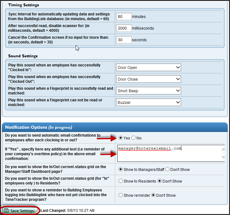 You can also set general timing and sound settings, as well as notification options. If you’d like to receive an email notification every time a user clocks in or out, enter the correct email address on this screen. Be sure to click Save Settings when done.
