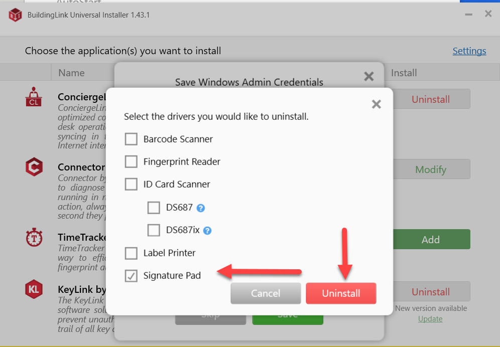 If you are still experiencing issues after restarting the service, then you can uninstall and reinstall the Signature Pad Drivers. Click on General then click Uninstall Drivers. Next the BuildingLink Universal Installer will request access to make changes and then offer you a list of drivers to uninstall. Check the box next to Signature Pad and click Uninstall. When you get the confirmation message that the drivers have successfully been uninstalled click Ok to close the window.