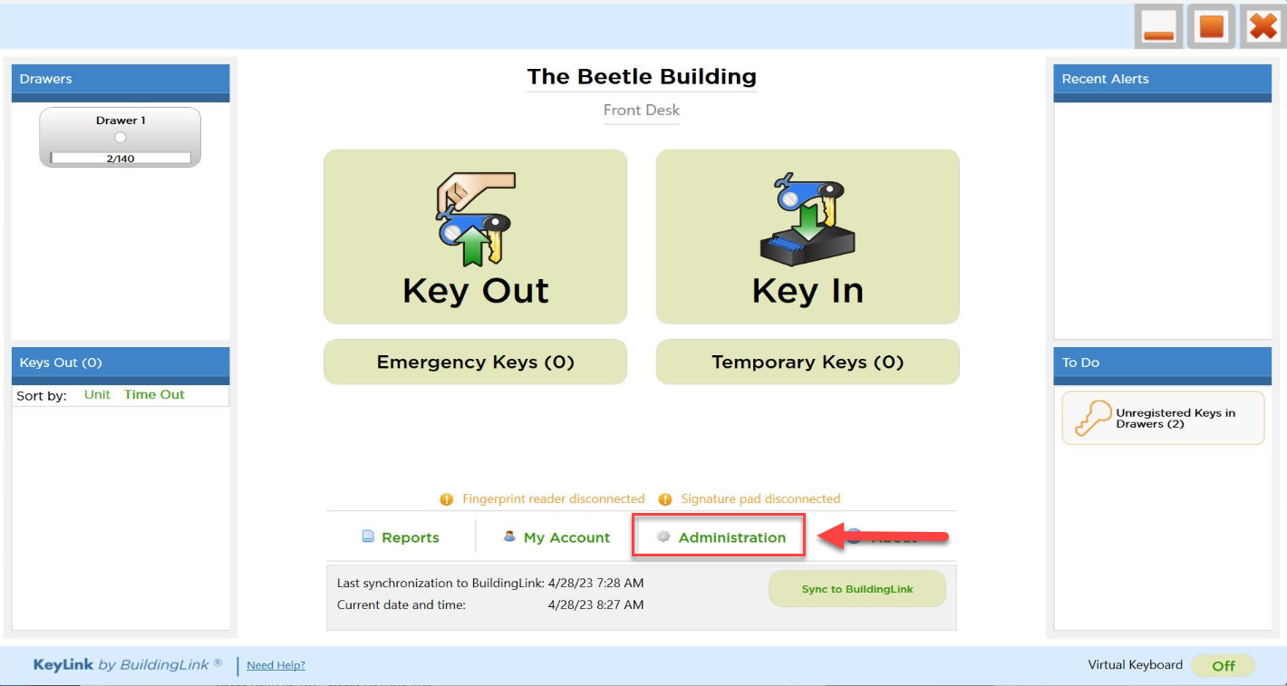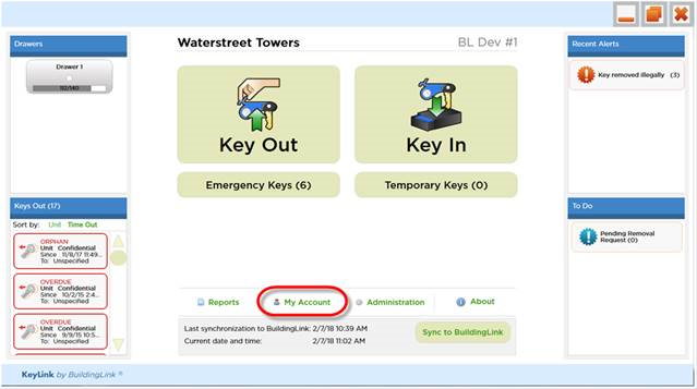 Finally, click the Sync to BuildingLink button on the KeyLink home screen, then try it out. Touch the fob to the round sensor on the front drawer and enter your PIN to remove a key.