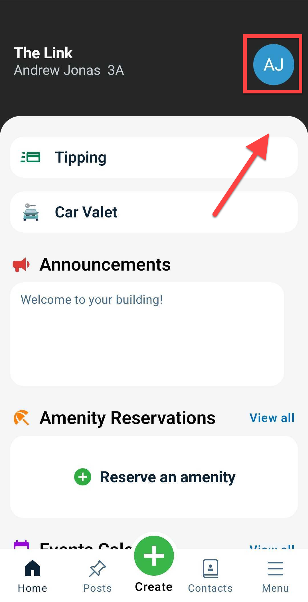 Announcements, Amenity Reservations, upcoming Calendar Events, or other sections for your specific building. (Again, these options are not available for all residents at all buildings.)