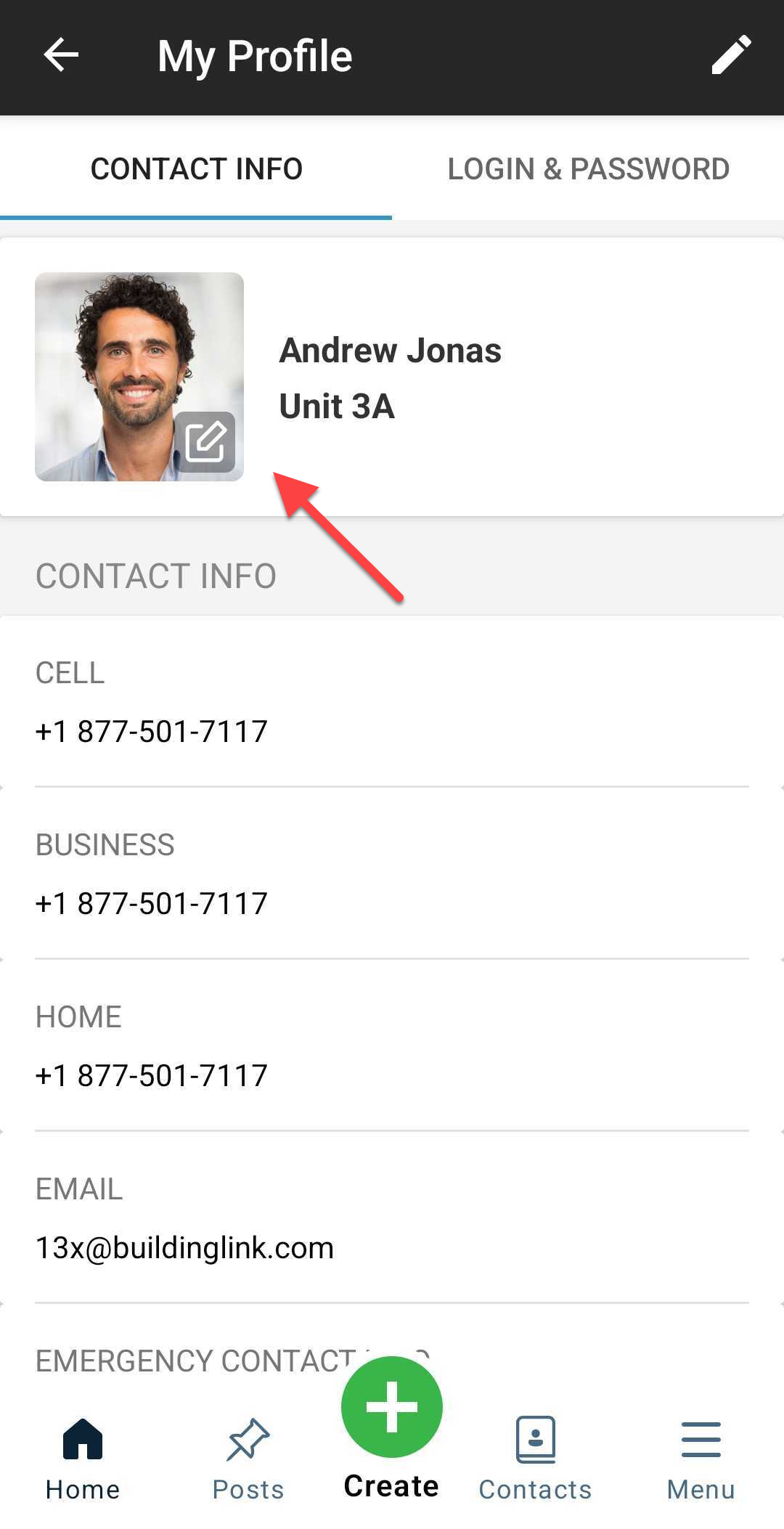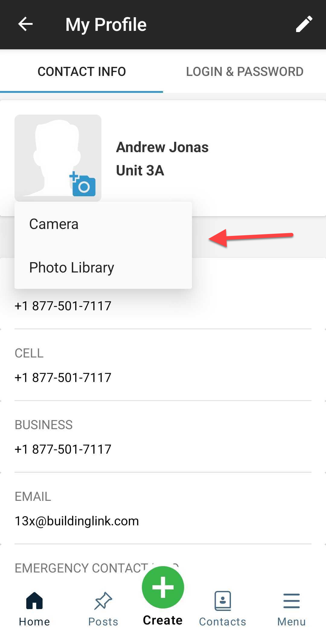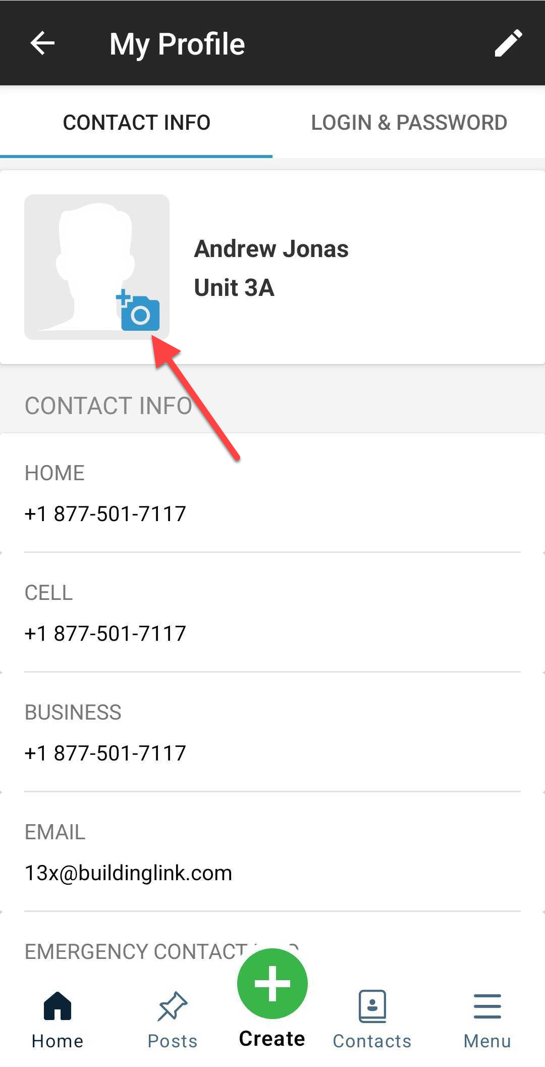 From the home screen, you can add a photo to your profile by tapping your Initials in the top right. On the next screen, tap the Camera icon, and you will have the option to either take a photo or upload one from your phone’s saved photo album. (You may need to adjust permissions to allow BuildingLink to access your photos/camera.)