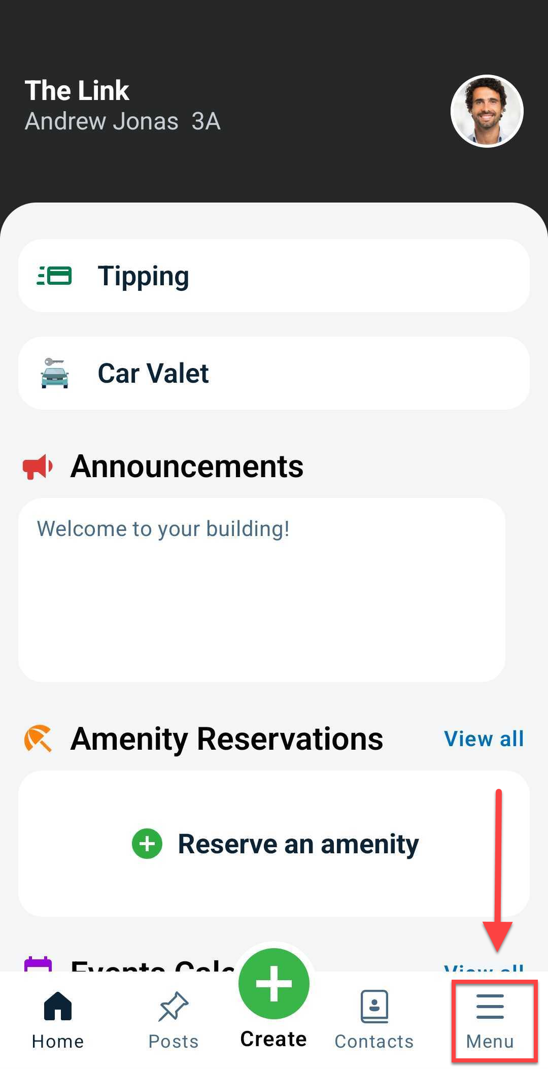 Tapping Menu at the bottom right of the resident app navigation bar has shortcuts to sections not on the app home screen, such as the building Library, Resident ID, or any Services, Offers or Vendors for your property.