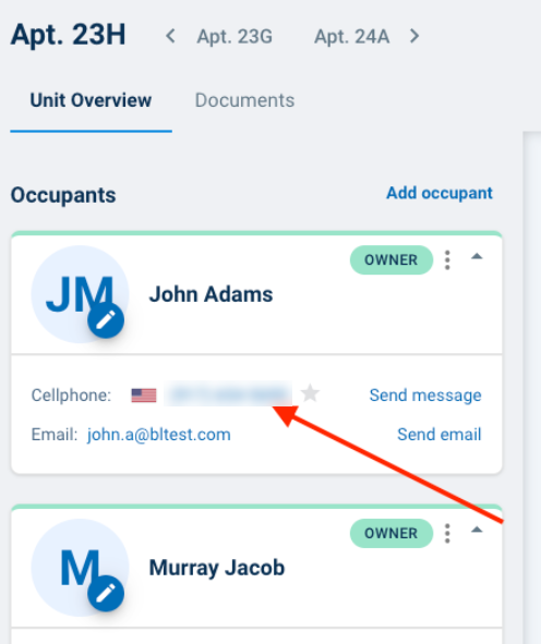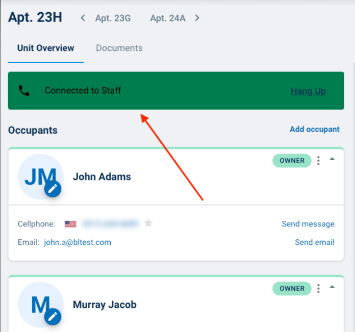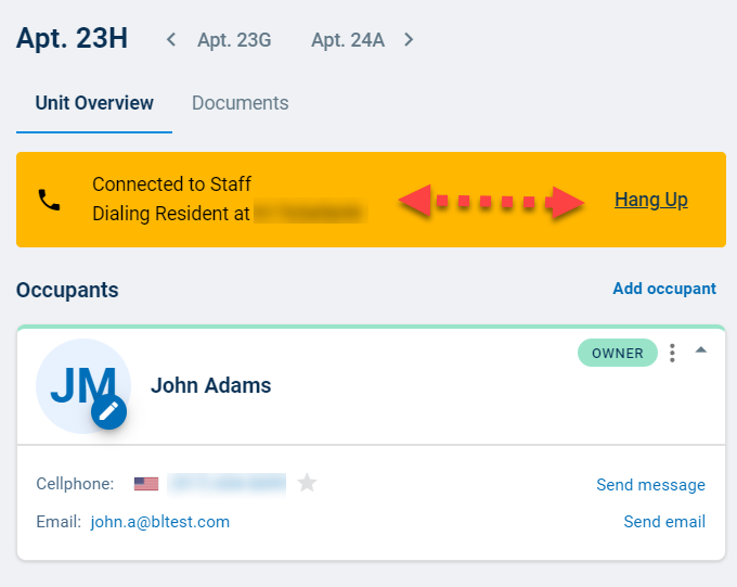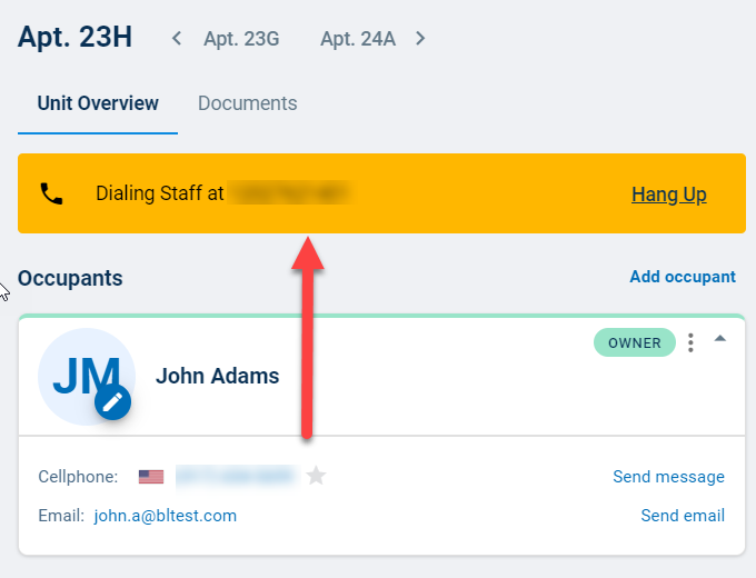 Next, pull up the Unit Overview for the resident you would like to call, then click the number listed in their contact information. The phone number entered into the "Autodialer callback number" field will ring.