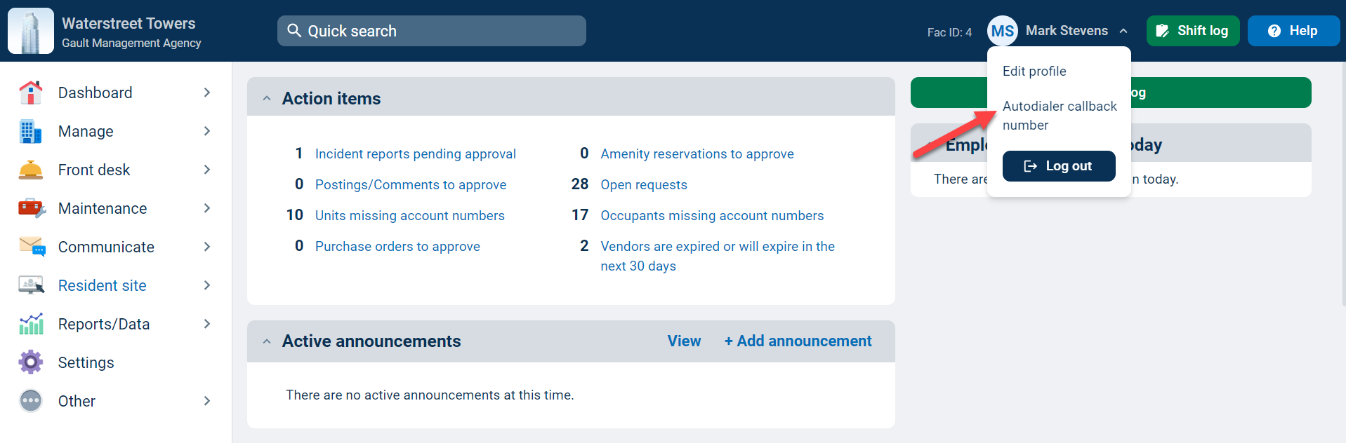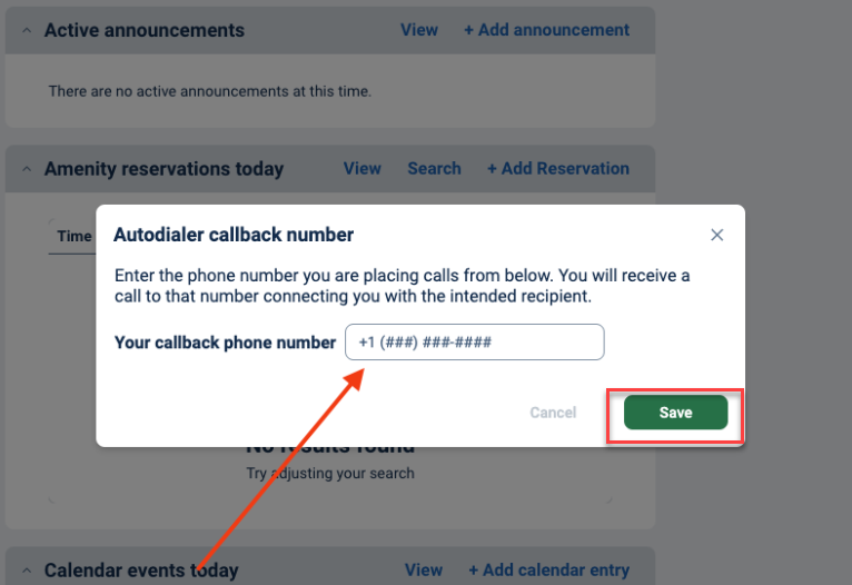 If you have not entered a number into the "Autodialer callback number" field before clicking the resident number, the system will prompt you to add it then. If you have made an error in the number for the staff, you can always go back to the "Autodialer callback number" field and re-enter the correct number.