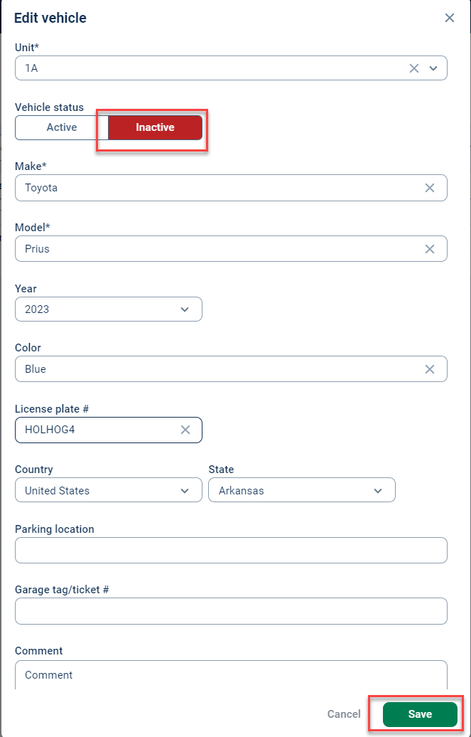 To archive a vehicle, click the Manage tab, then Parking management, and select the Vehicle management tab. Click on the vehicle entry whose information you need to archive. Under the "Vehicle status" field, select Inactive and click Save.