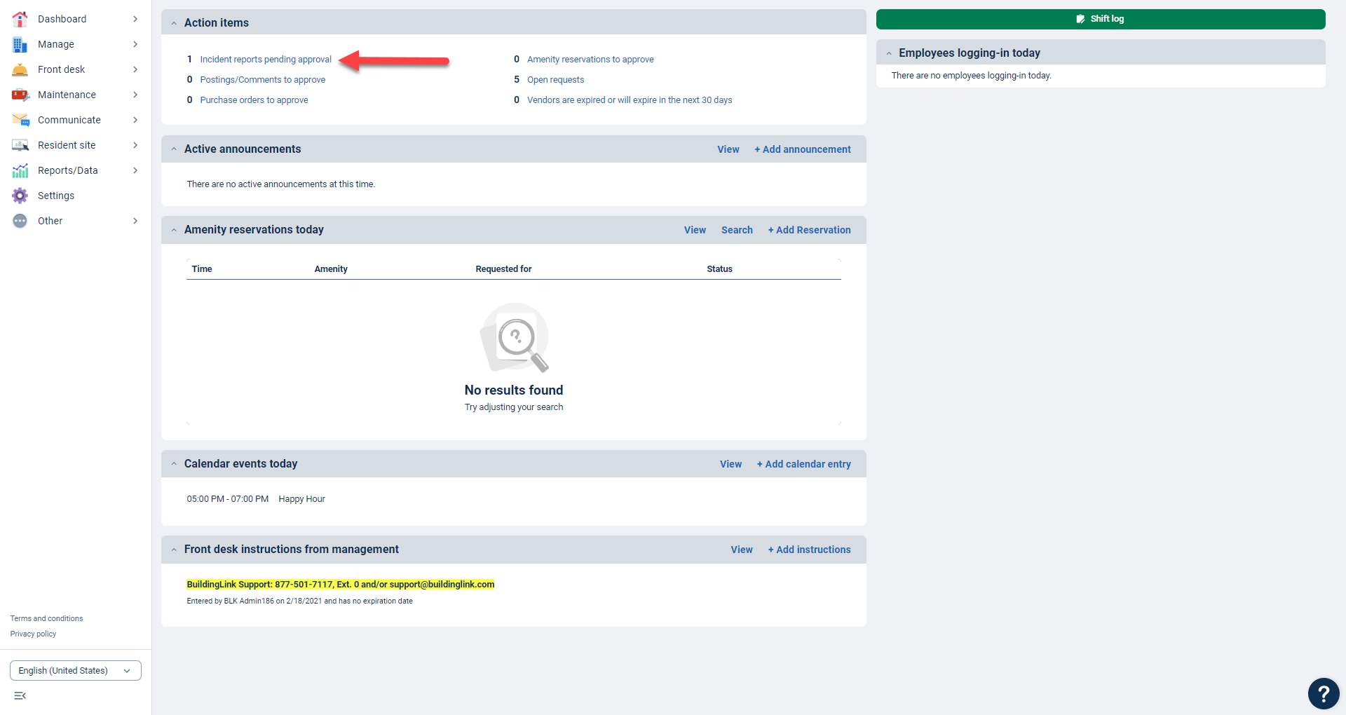 Note: Unless limited by a Special Permission, All BuildingLink users, regardless of authority levels, will always be able to use the Show today’s incidents link at the top of the Shift Log as a shortcut to the Incident Reports module.