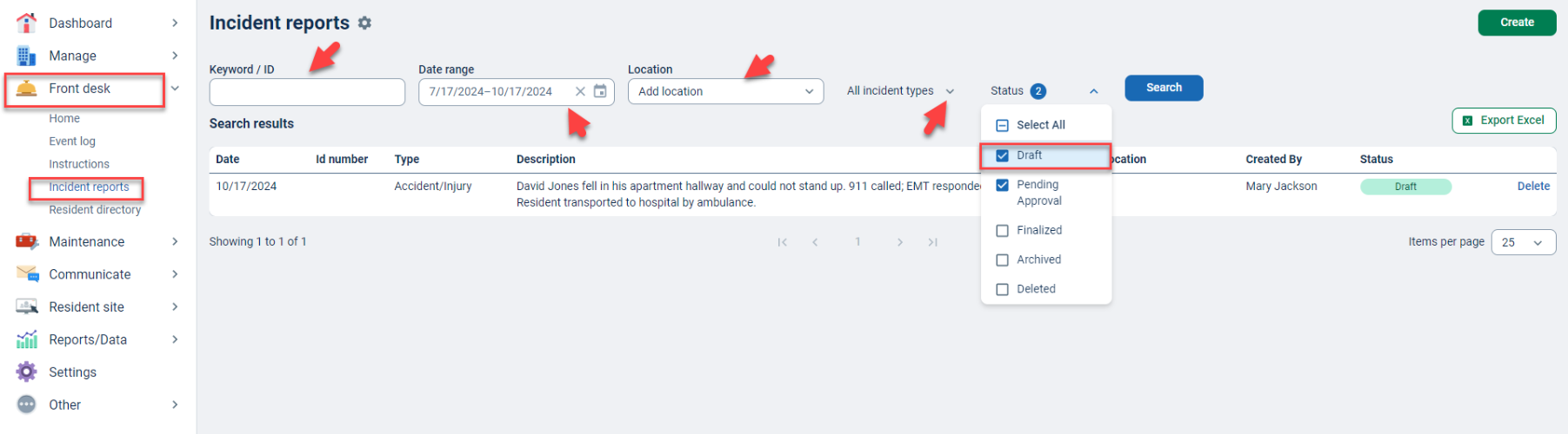 You can use the search boxes at the top of the screen to filter your reports by keyword/Id number, date range, and location. Then, use the dropdown menus to filter by checking the boxes of the statuses and types of incidents you want to include in your search.
