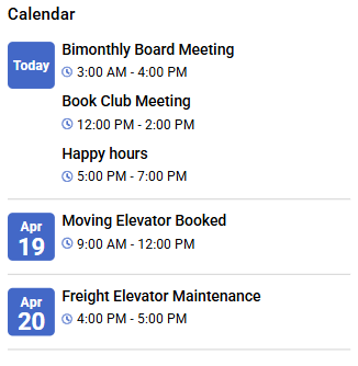 The Calendar events widget can display upcoming events you've entered into the Building Calendar under the Management tab. Listed below are the current available Calendar settings: