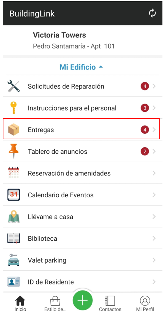 Nota: El aspecto de la sección "Entregas" es personalizable y podría ser diferente en la aplicación para residentes de su propiedad.