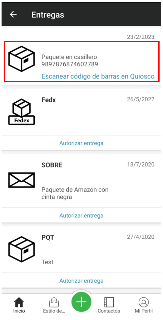 Nota: Los paquetes guardados en un casillero muestran el texto "Escanear código de barras en el quiosco" en la parte inferior del evento.