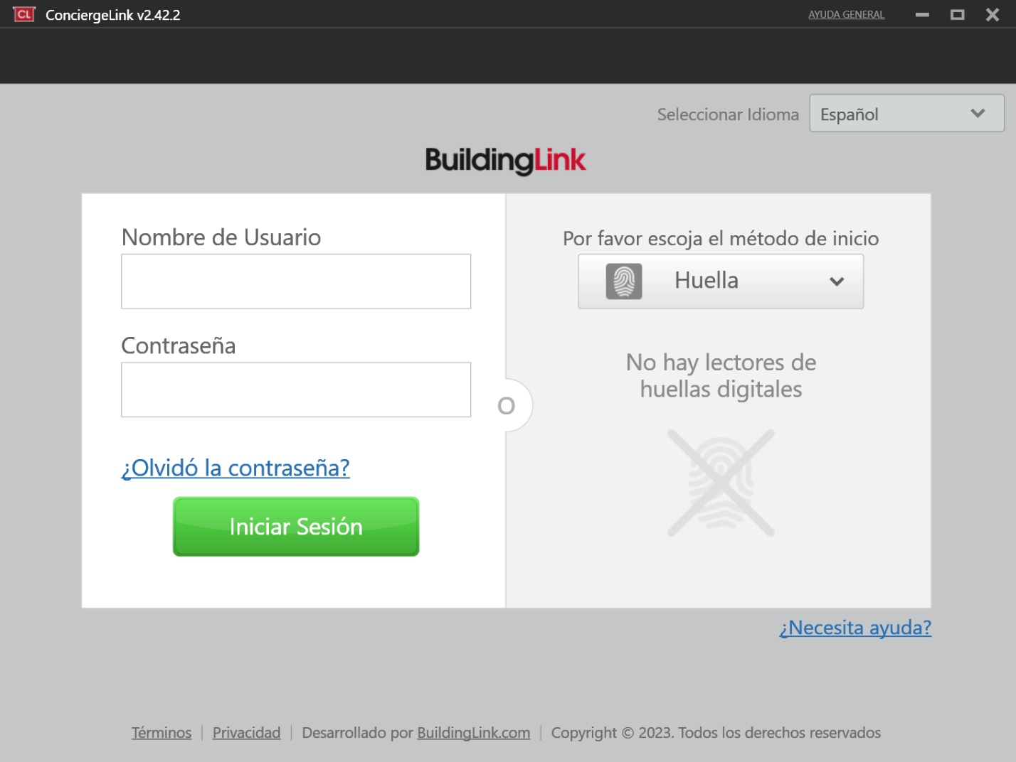 *Es importante iniciar sesión al menos una vez después de instalar ConciergeLink. Al iniciar sesión, los datos de la propiedad en BuildingLink (la información de los residentes, paquetes, solicitudes de mantenimiento, etc.) se sincroniza con ConciergeLink de manera que el programa muestre siempre la información más actualizada. Después de la primera sincronización, ConciergeLink seguirá sincronizándose en segundo plano (incluso si nadie está conectado) para que el personal pueda utilizarlo sin problemas si se interrumpe la conexión a internet. Sin embargo, si no se realiza la primera sincronización completa, no dispondrá de información actualizada a menos que esté conectado a internet.