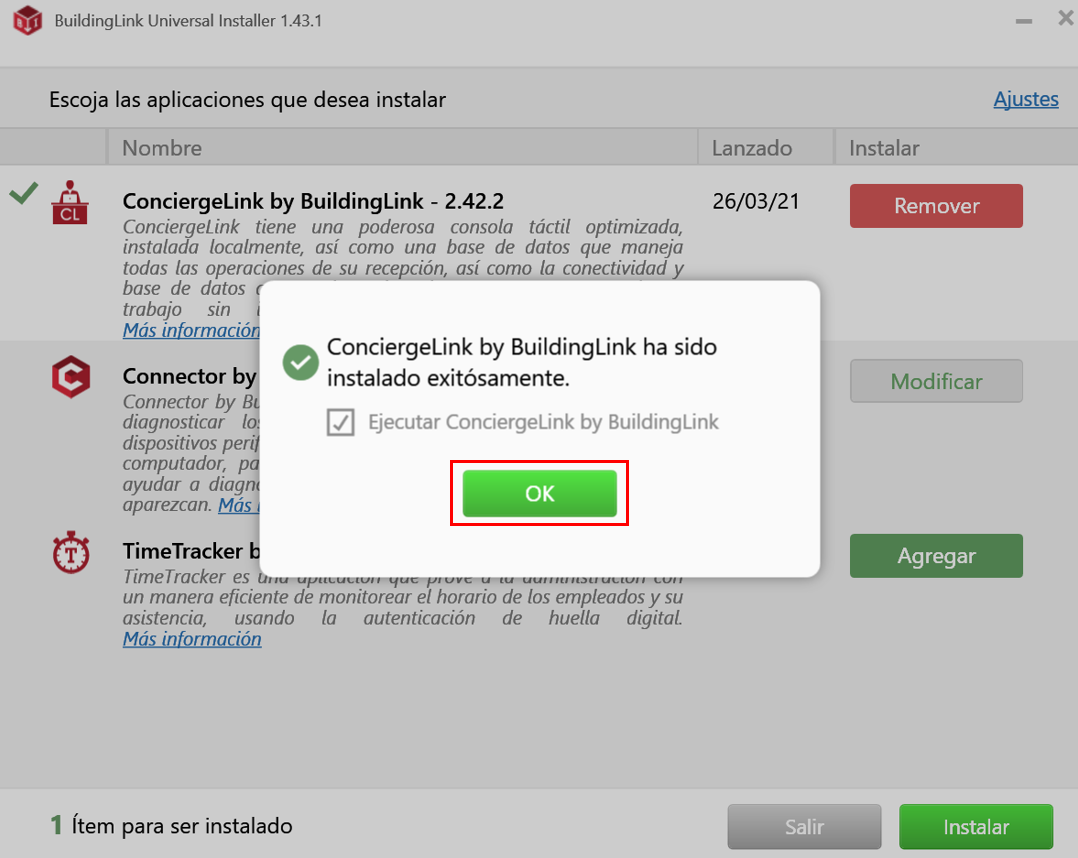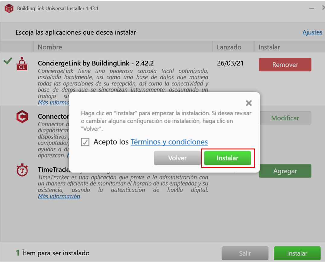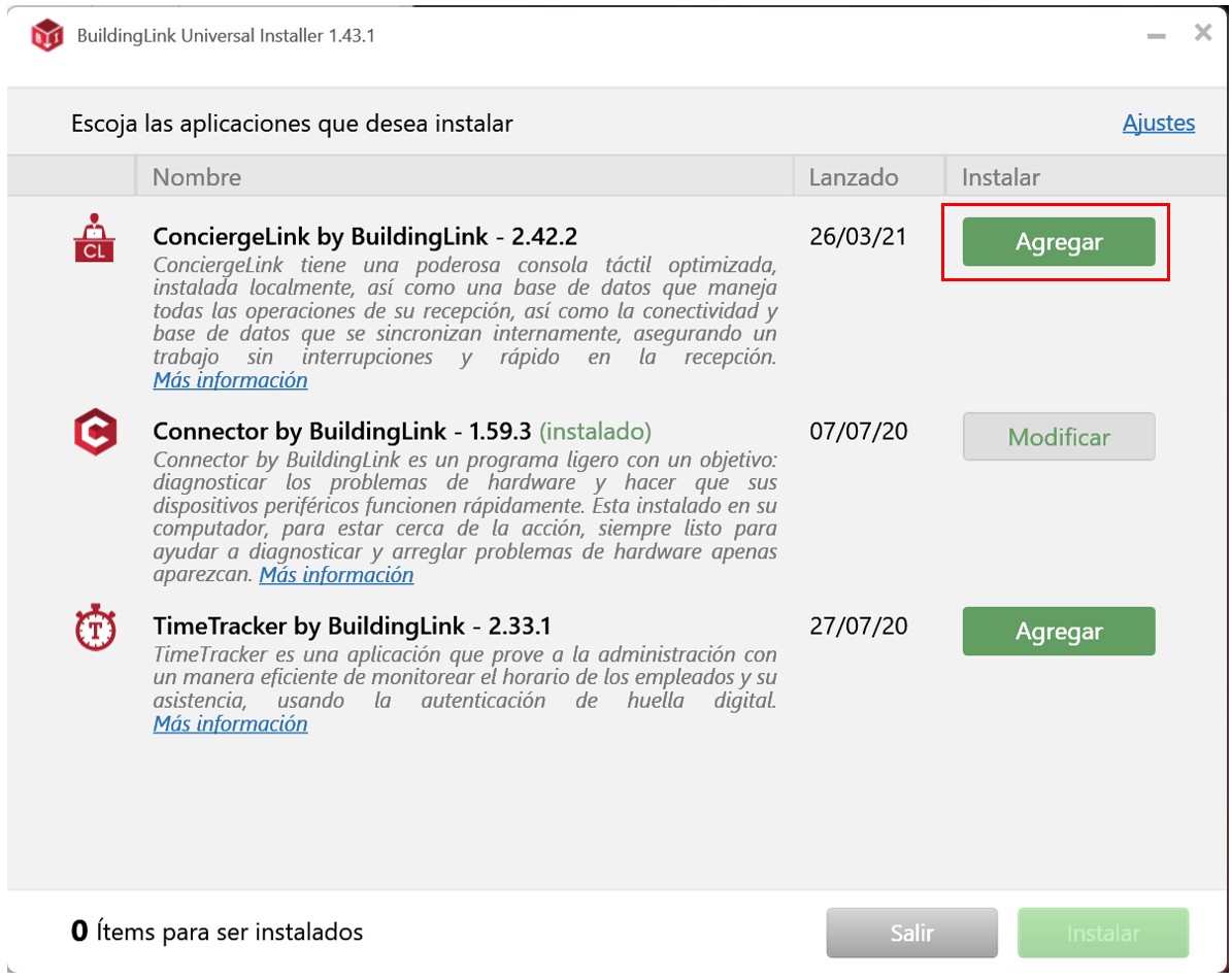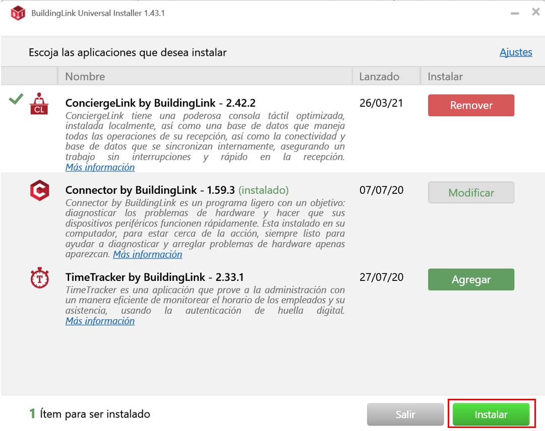 ResumenLas siguientes capturas de pantalla le guiarán en el proceso de instalación de ConciergeLink utilizando el programa Universal Installer de BuildingLink. Si no tiene Universal Installer de BuildingLink haga clic aquí para descargarlo. Si tiene alguna consulta, por favor, escríbanos a support@buildinglink.com.