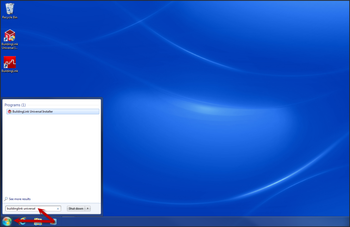 Si no encuentra el ícono en el escritorio, haga clic en el logo de Windows en la esquina inferior izquierda de la pantalla y busque "BuildingLink Universal Installer". Haga clic en el programa para abrirlo.