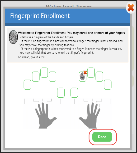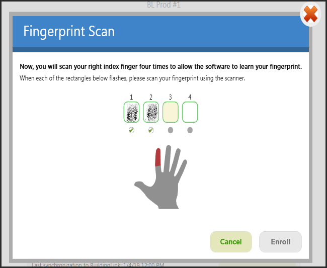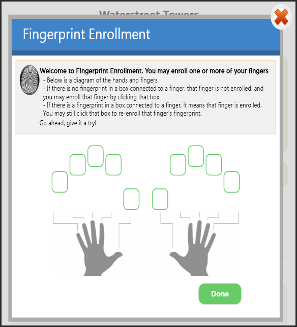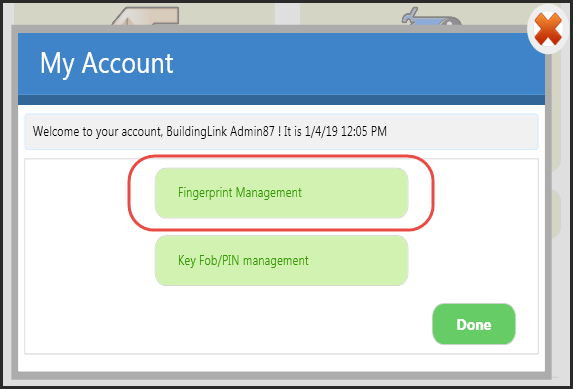 Haga clic en el botón My Account (Mi cuenta). Inicie sesión con su nombre de usuario y contraseña de BuildingLink, seleccione Fingerprint Management (Administrar huellas dactilares) y siga las instrucciones de la pantalla "Fingerprint Enrollment" (Registro de huellas dactilares). Elija el dedo que desea registrar, colóquelo en el lector y escanéelo cuatro veces. Después de cada escaneo, debe ver su huella dactilar en la pantalla. Después, haga clic en Enroll (Registrar). A continuación, volverá automáticamente a la página anterior donde, si lo desea, puede registrar más dedos. Haga clic en Done (Listo) cuando haya terminado.