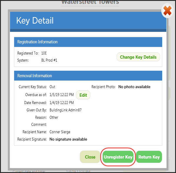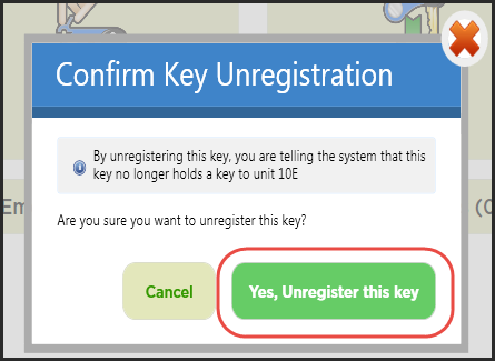 Para retirar permanentemente una llave del sistema, debe cancelar el registro de la llave. Si la llave aún se encuentra en el cajón, lleve a cabo el proceso de retiro de la llave y elija Unregister Key (Cancelar llave) como razón para retirar la llave. Una vez retirada la llave, se abrirá una pantalla que le preguntará si confirma que quiere cancelar el registro de la llave. Elija Yes (Sí). Si la llave no se encuentra en el cajón, puede seleccionarla en la sección Keys Out (Llaves extraídas) de la pantalla principal. Elija Unregister Key (Cancelar llave). Una vez que haya seleccionado Unregister Key, deberá identificarse y confirmar que desea cancelar el registro de la llave. Si se devuelve al sistema una llave con su registro cancelado, el sistema la tratará como una llave nueva y se abrirá la pantalla "Register Key" (Registrar llave).
