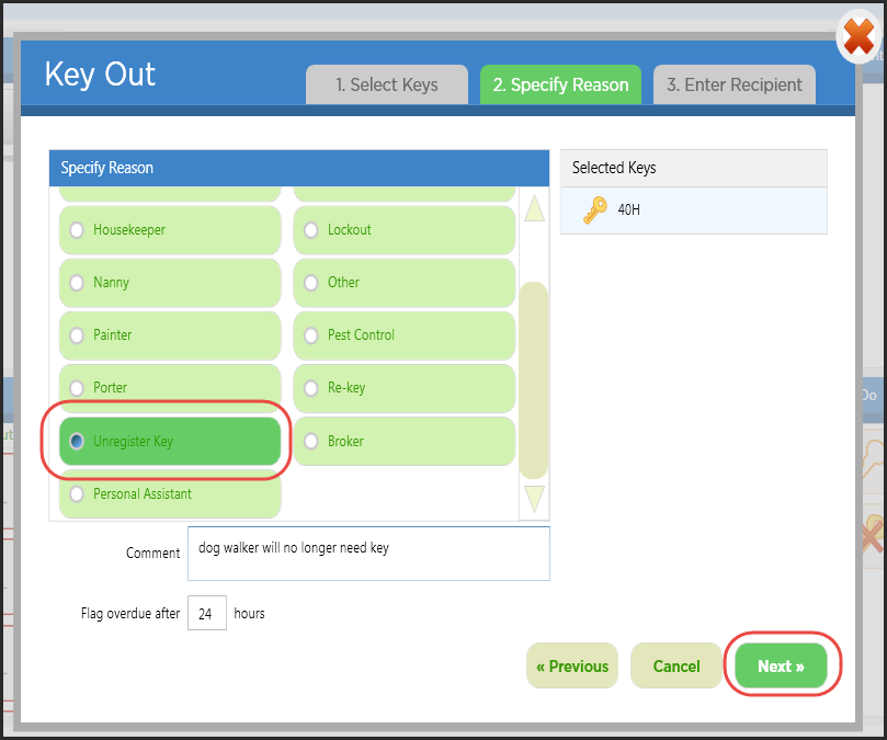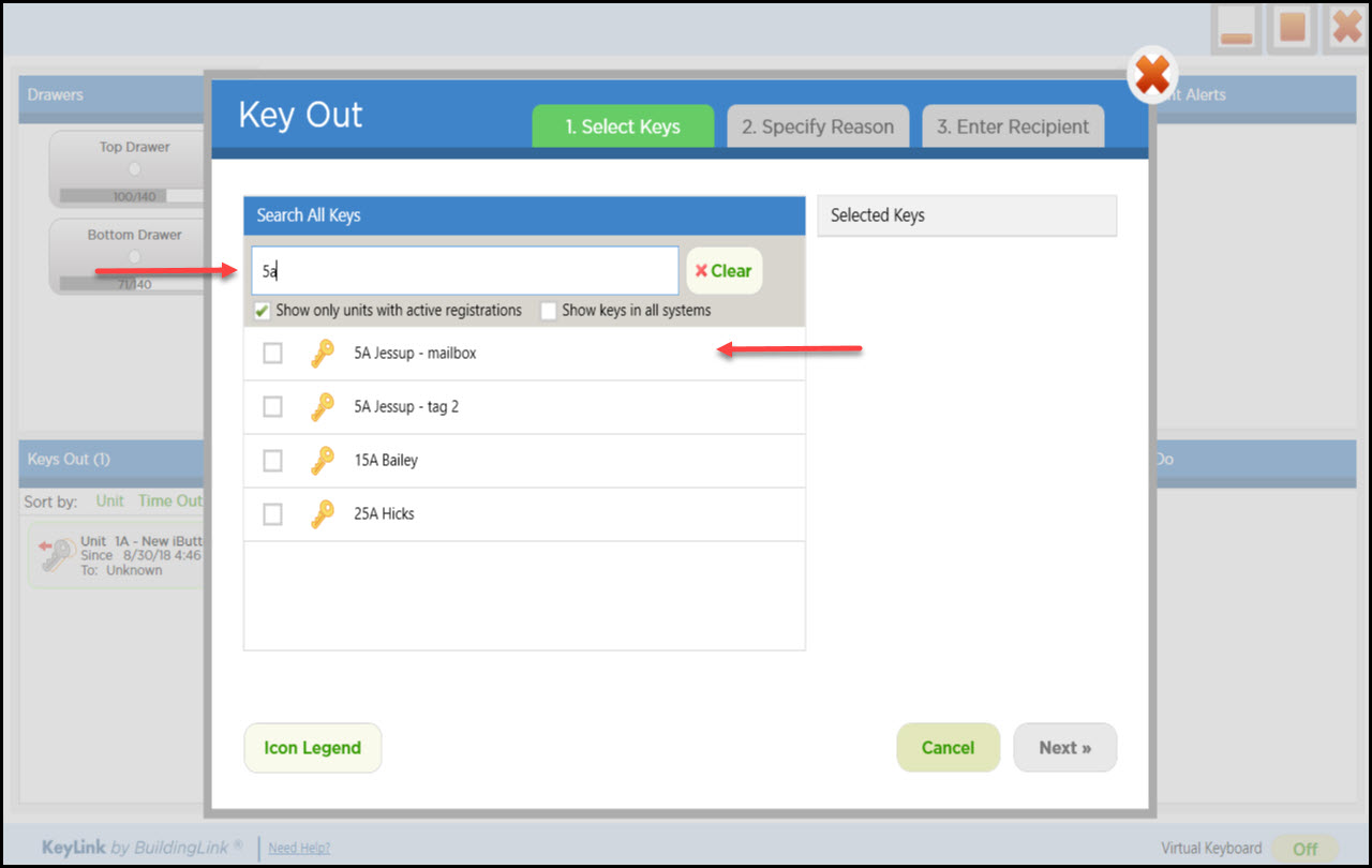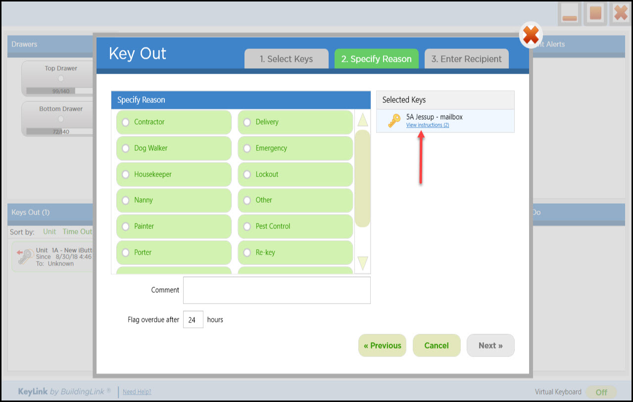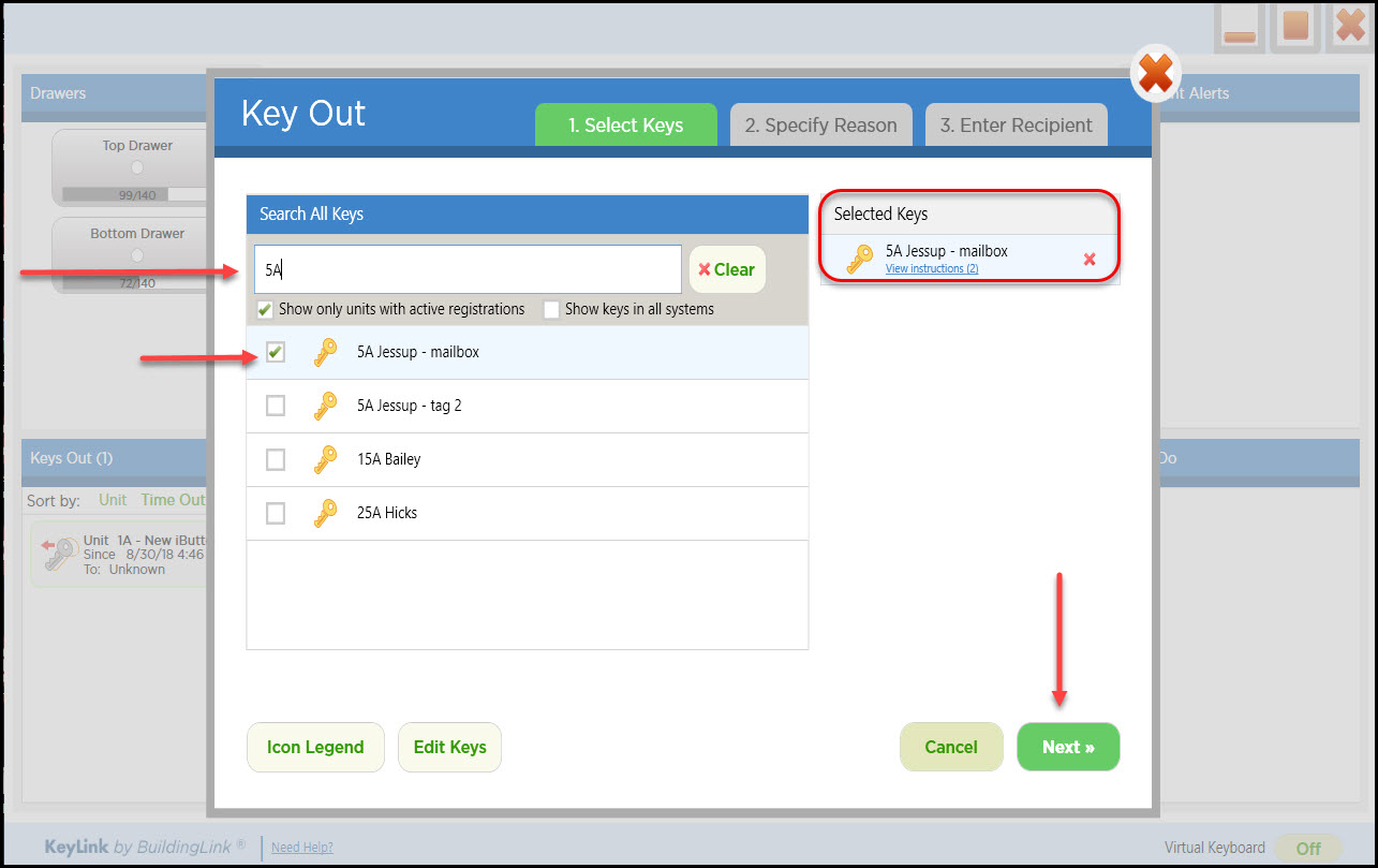 Para retirar una llave, haga clic en el botón Key Out (Extraer llave). En la siguiente pantalla, escriba el Número de unidad de la llave que está buscando y haga clic en la llave que desea retirar en el cuadro de búsqueda (nota: al seleccionar una llave, esta se mueve al lado derecho de la pantalla). Haga clic en Next (Siguiente). Haga clic en el motivo por el cual está retirando la llave y haga clic en Next (Siguiente). Si ha habilitado la configuración de KeyLink para Tipos de instrucciones específicos, podrá seleccionar "View Instructions" (Ver instrucciones) debajo de la llave seleccionada para ver las instrucciones en el archivo de la unidad y determinar quién puede retirar la llave. Para retirar la llave, escriba el nombre de la persona destinataria, pídale que firme en el digitalizador de firmas y tómele una foto con la webcam. A continuación, haga clic en el botón verde Get Key (Obtener llave). Esto abrirá la página de autenticación. Inicie sesión con su huella dactilar o nombre de usuario y contraseña de BuildingLink. Una vez que se haya identificado correctamente, el cajón se desbloqueará. Abra el cajón y la llave se iluminará; retire la llave y cierre el cajón para finalizar el proceso.