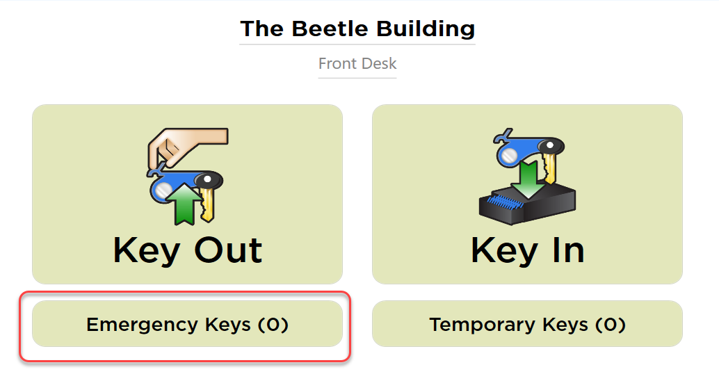 Al registrar una llave, tiene la opción de designarla como Emergency Key (Llave de emergencia). Al presionar el botón Emergency Keys (Llaves de emergencia) se muestra una ventana con todas las Llaves de emergencia para que pueda elegir y retirarlas según sea necesario. Esto puede ser especialmente útil en una emergencia en la que necesite ubicar todas esas llaves rápidamente y retirarlas todas a la vez (por ejemplo: la llave de la puerta delantera, llave de la puerta lateral, llave de la piscina, llave del elevador, llave de iluminación, etc.).