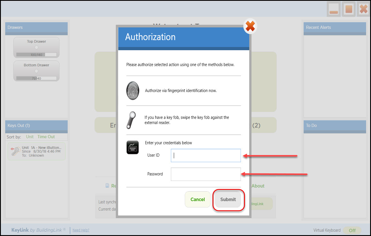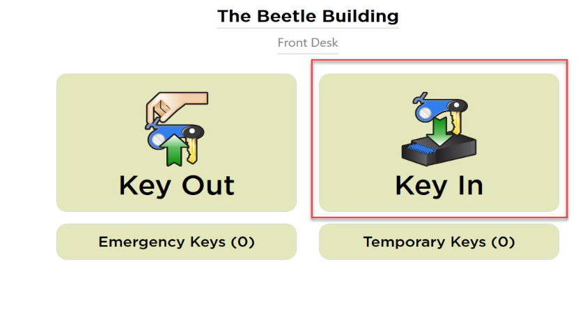 Para devolver una llave, haga clic en el botón Key In (Ingresar llave). Esto abrirá la página de autenticación. Inicie sesión con su huella dactilar o nombre de usuario y contraseña de BuildingLink. Una vez que se haya identificado, el cajón se desbloqueará. Coloque la llave en cualquier ranura vacía y escuchará un pitido; también asegúrese de que en la pantalla diga "Key Returned" (Llave devuelta). Cierre el cajón para finalizar el proceso.