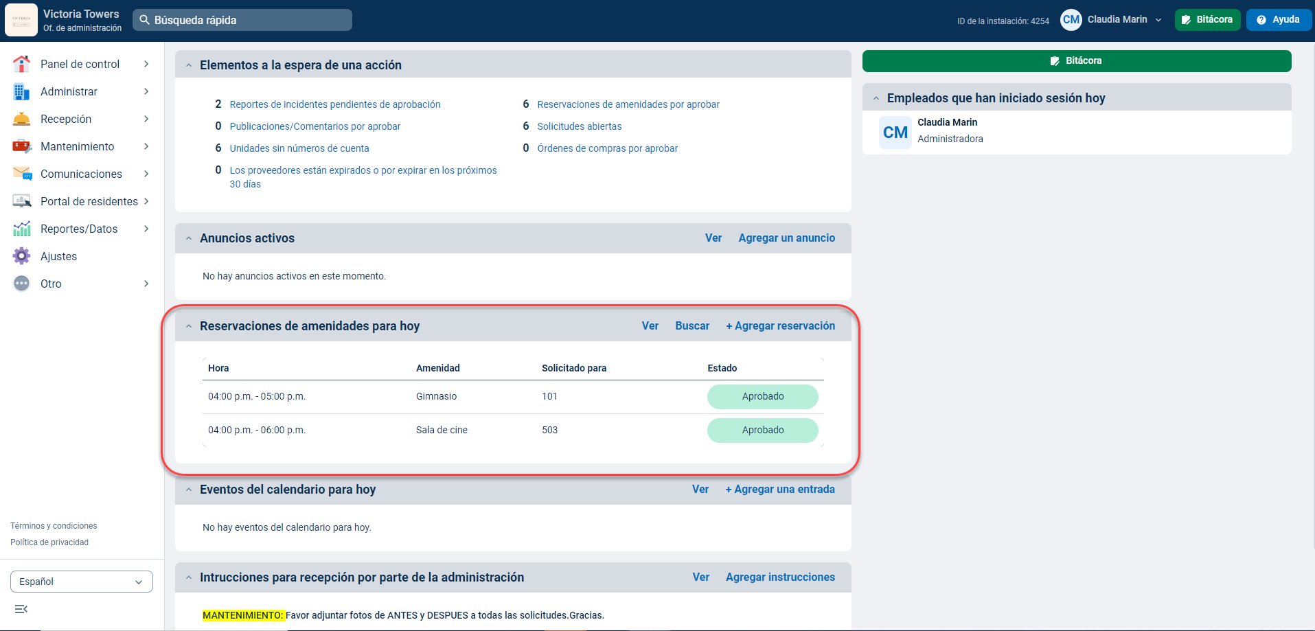 Todas las reservaciones de amenidades para el día, solicitadas o aprobadas, se mostrarán en esta sección y puede darle al personal la posibilidad de enviar solicitudes de reservaciones desde ahí.
