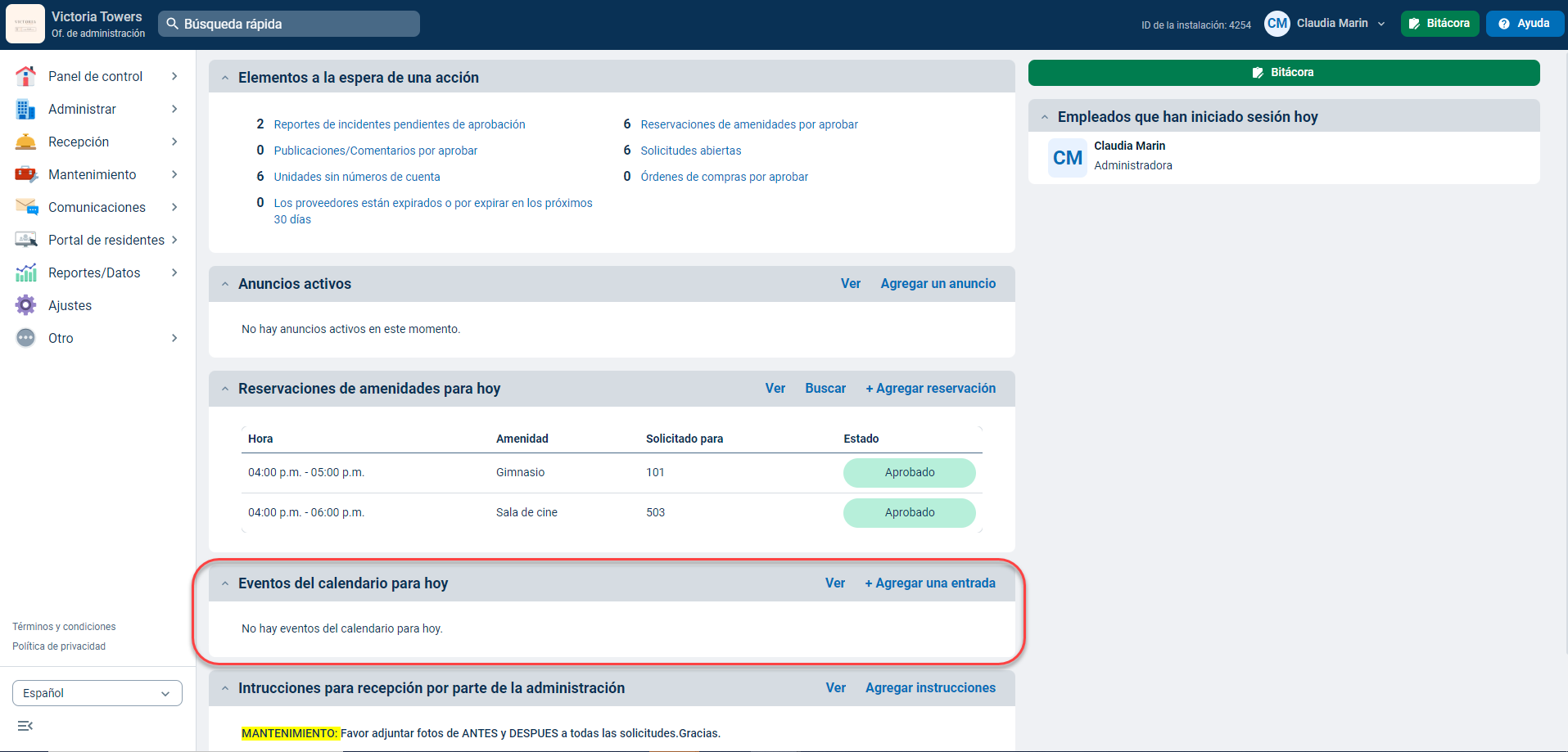 ResumenLa página de Inicio es la primera página que ven todos los miembros del personal cuando inician sesión. La página de Inicio brinda un resumen general de toda la información importante relacionada con la propiedad (como reservaciones en espera de aprobación, eventos del calendario programados para el día, anuncios, etc.), así como otra información útil.