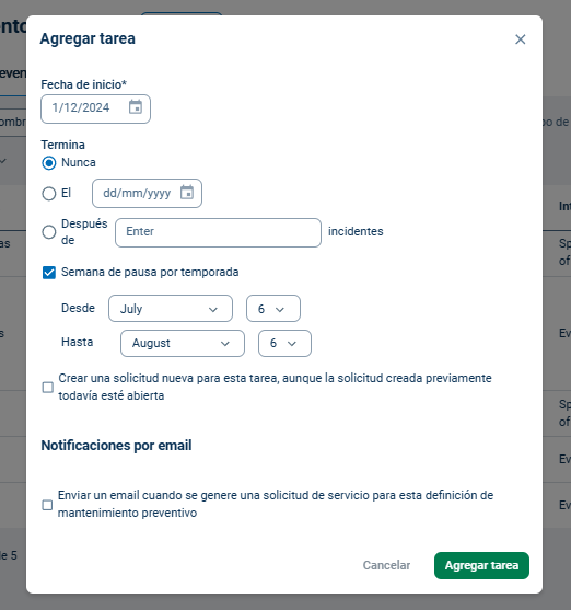 También puede elegir una pausa por temporada si es necesario. Si es así, no se creará la tarea durante el periodo seleccionado. Si la tarea debe realizarse durante todo el año, puede omitir este paso.