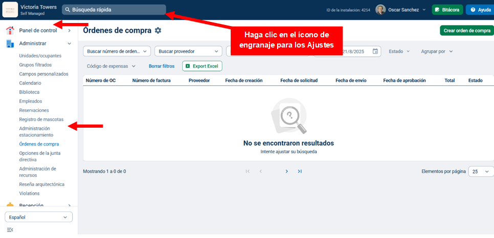 Haga clic en Administrar, a la izquierda. Luego seleccione Órdenes de compra. Haga clic en el ícono del engranaje para ingresar a la página de ajustes.