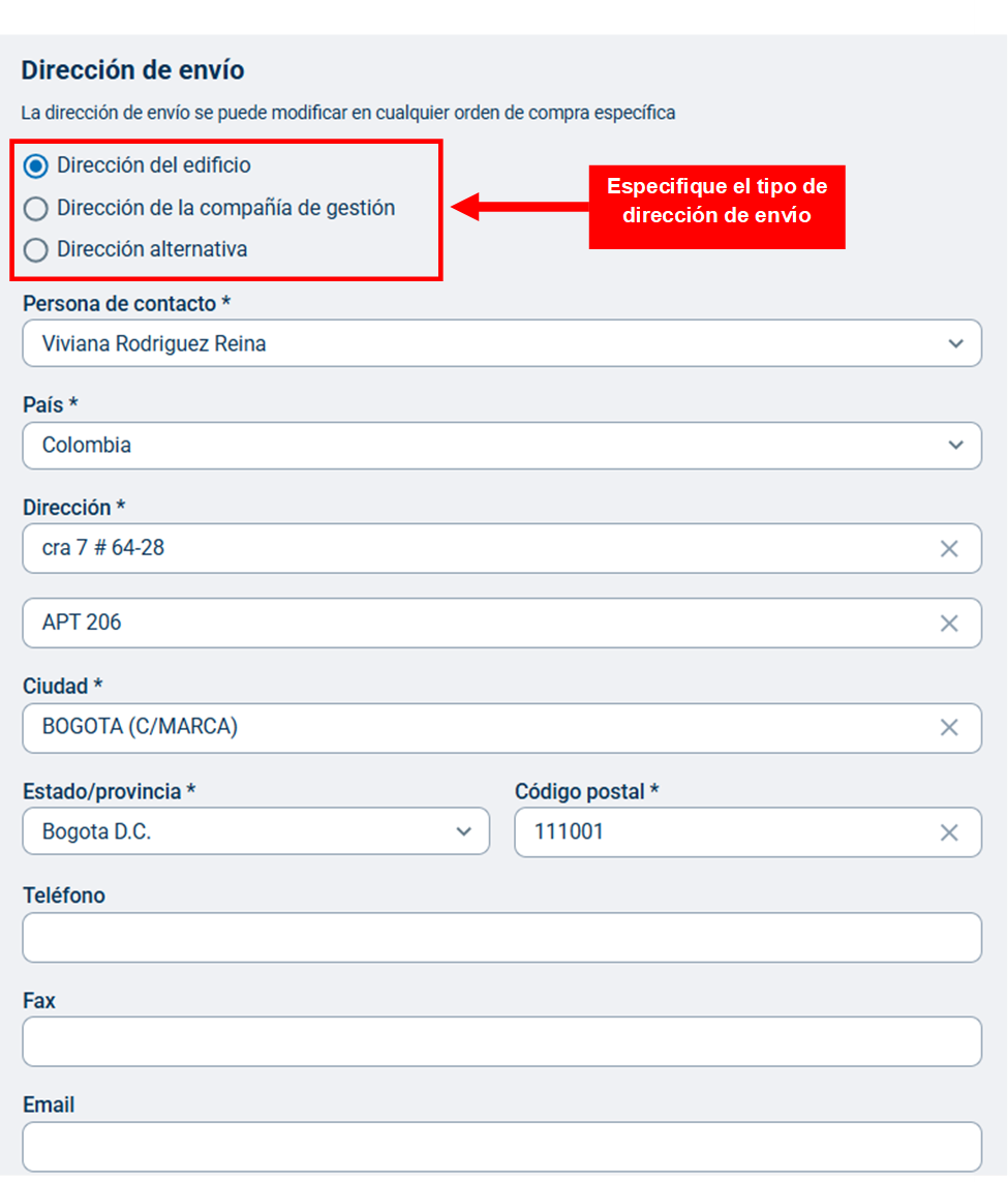 Especifique el tipo de dirección de envío. Luego ingrese la dirección predeterminada a la que se enviarán las órdenes de compra. Puede modificar la dirección cuando cree una orden de compra, si necesita que la envíen a otro lugar.