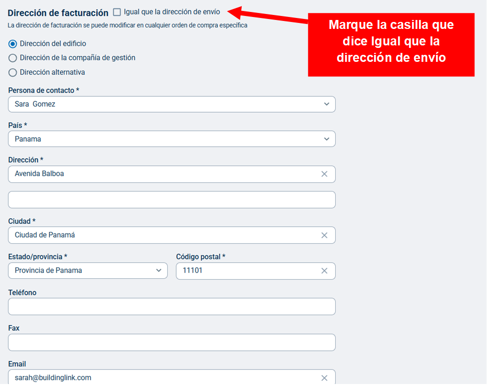 A continuación, ingrese la dirección de facturación predeterminada. Si es la misma que la dirección de envío, puede marcar el casillero que dice Igual que la dirección de envío. De lo contrario, seleccione el tipo de dirección y complete la información.